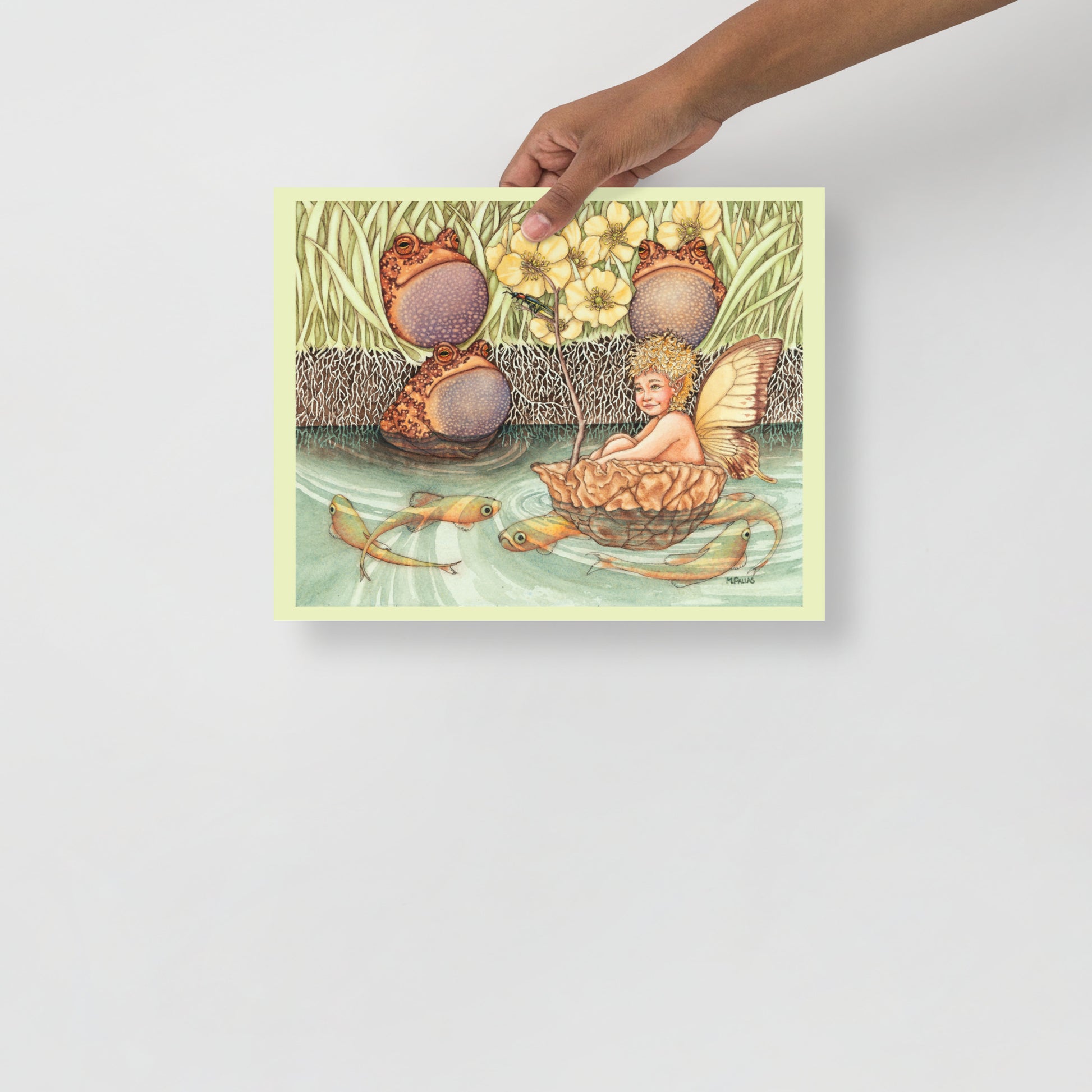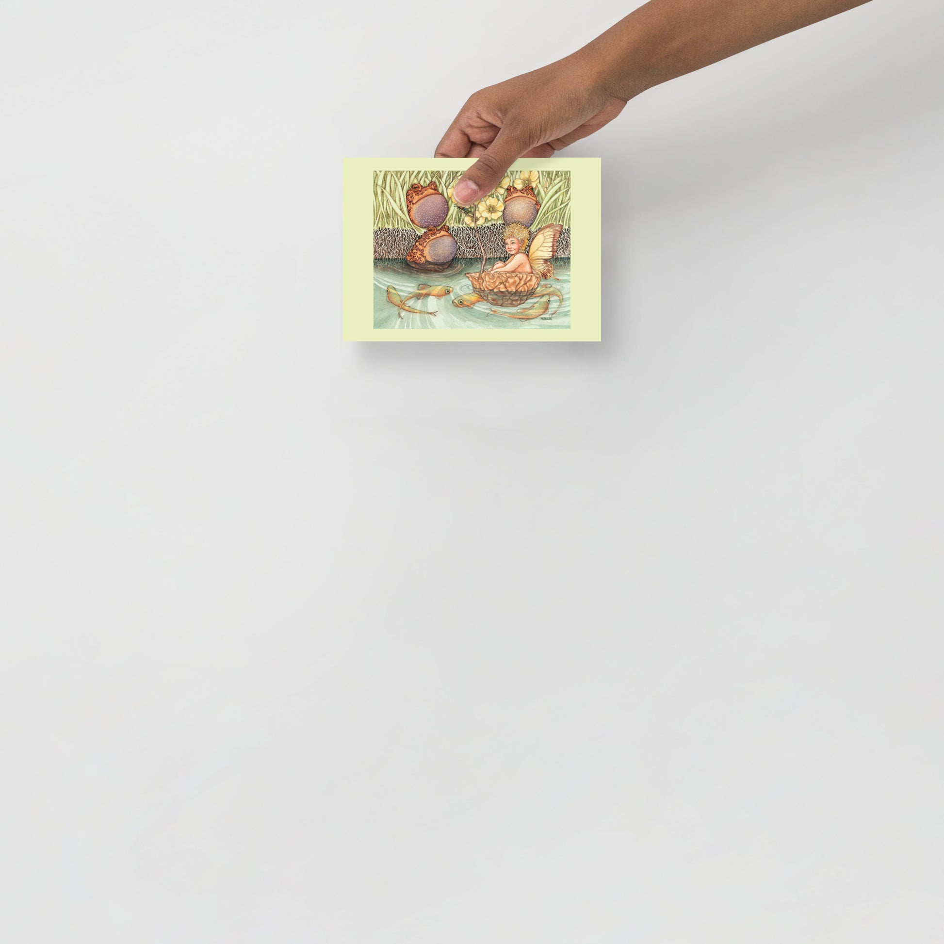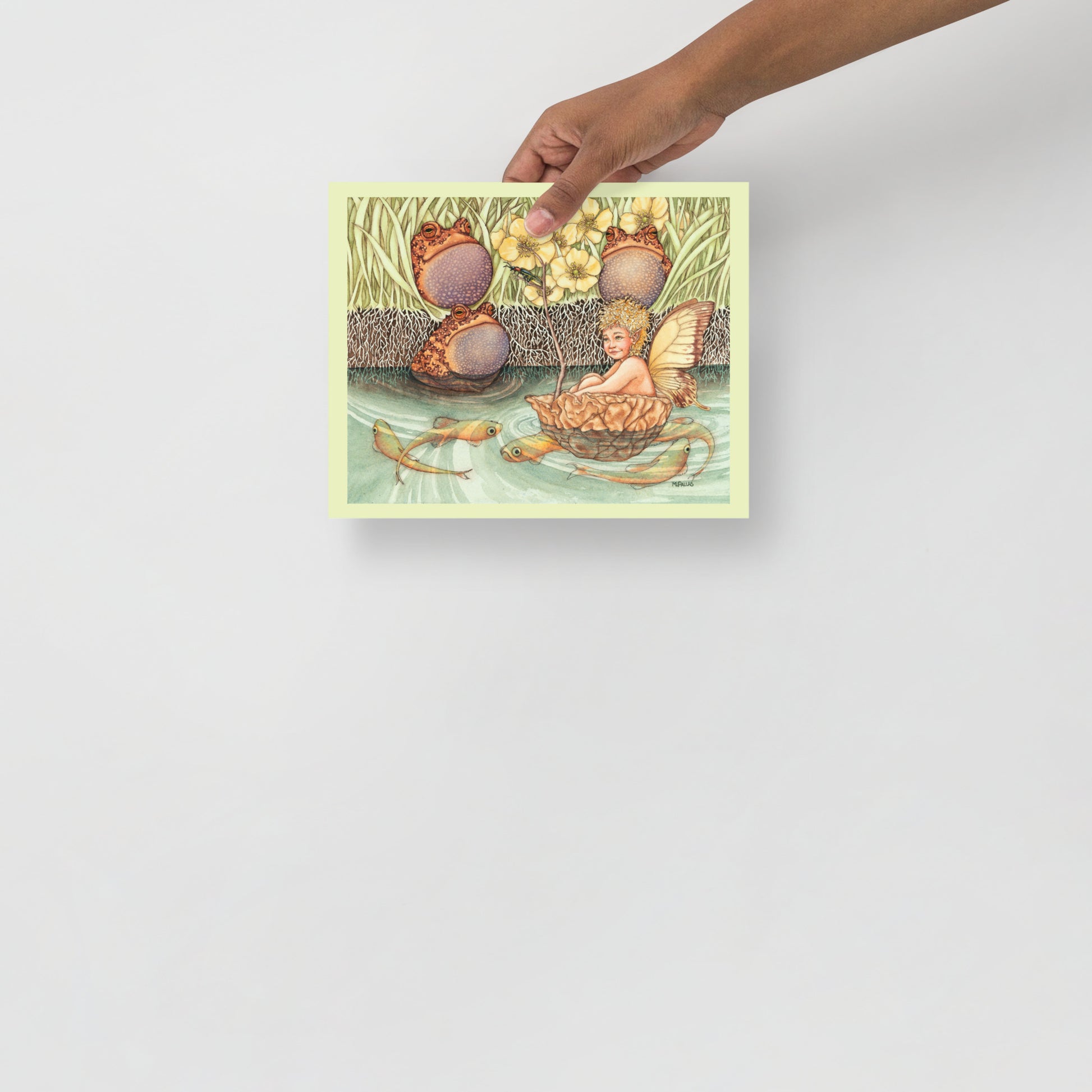 This painting was inspired by the story of Thumbelina but it was given a twist with my imaginative touch. Look closely, there is a lightning bug on this fairy's walnut boat mast to give light and help lead the way when night closes in.