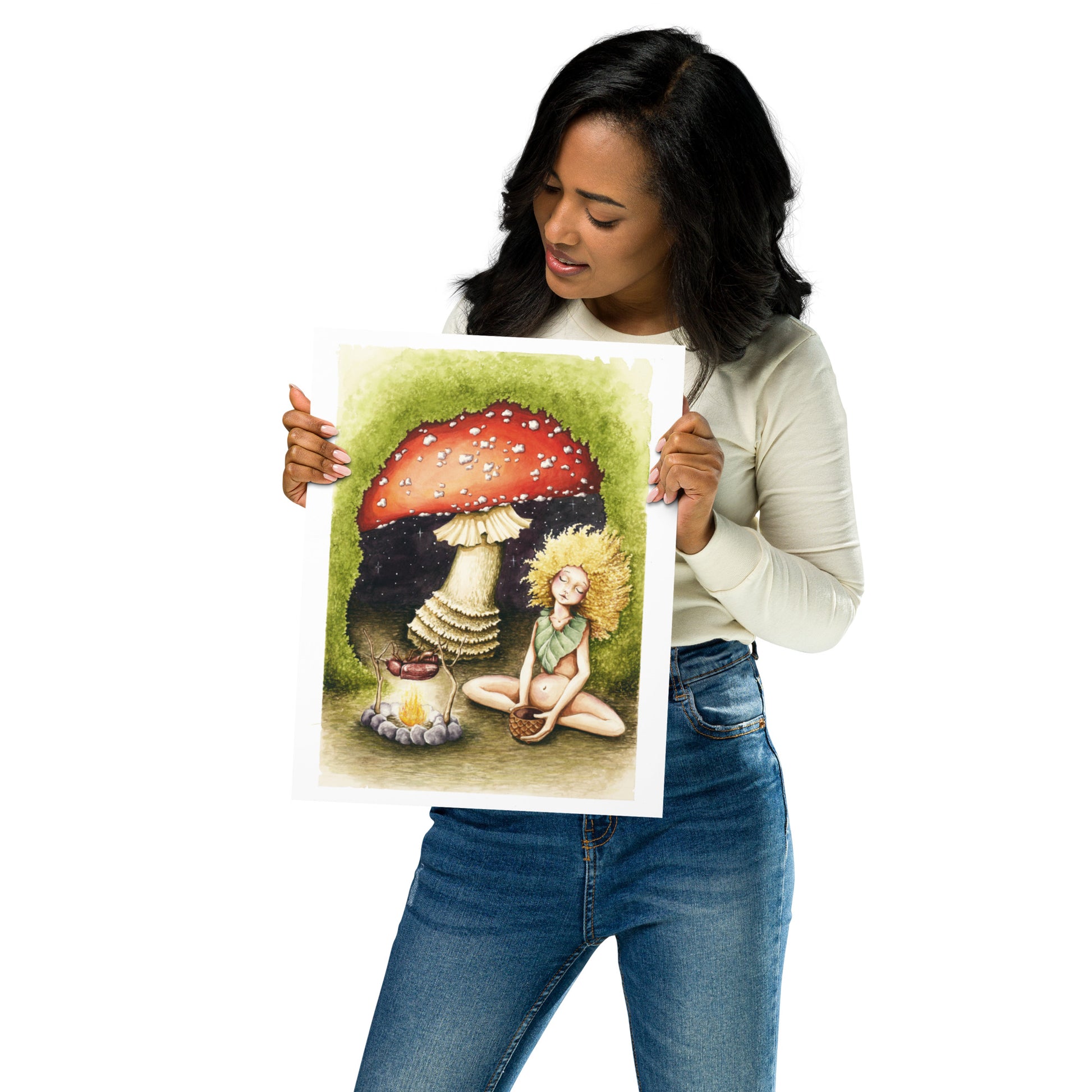 This painting was inspired by how I imagine a fairy might wind down in the evening just outside her mushroom home.